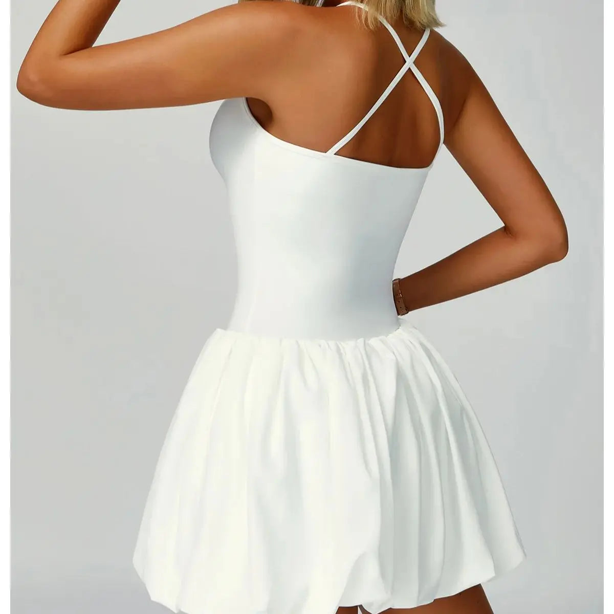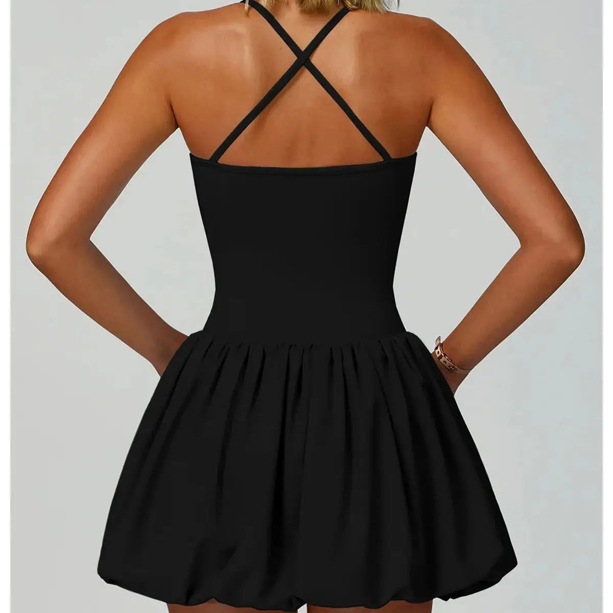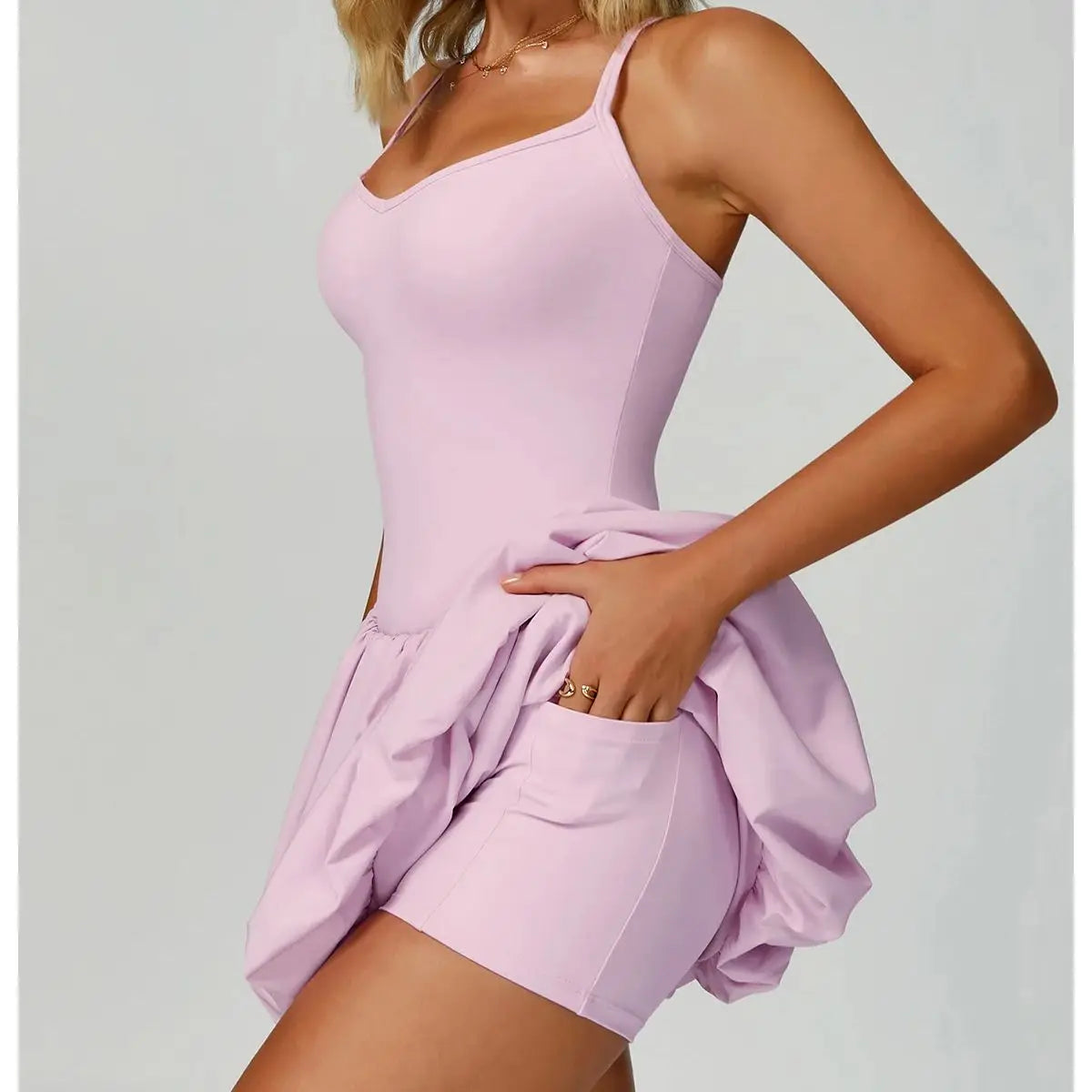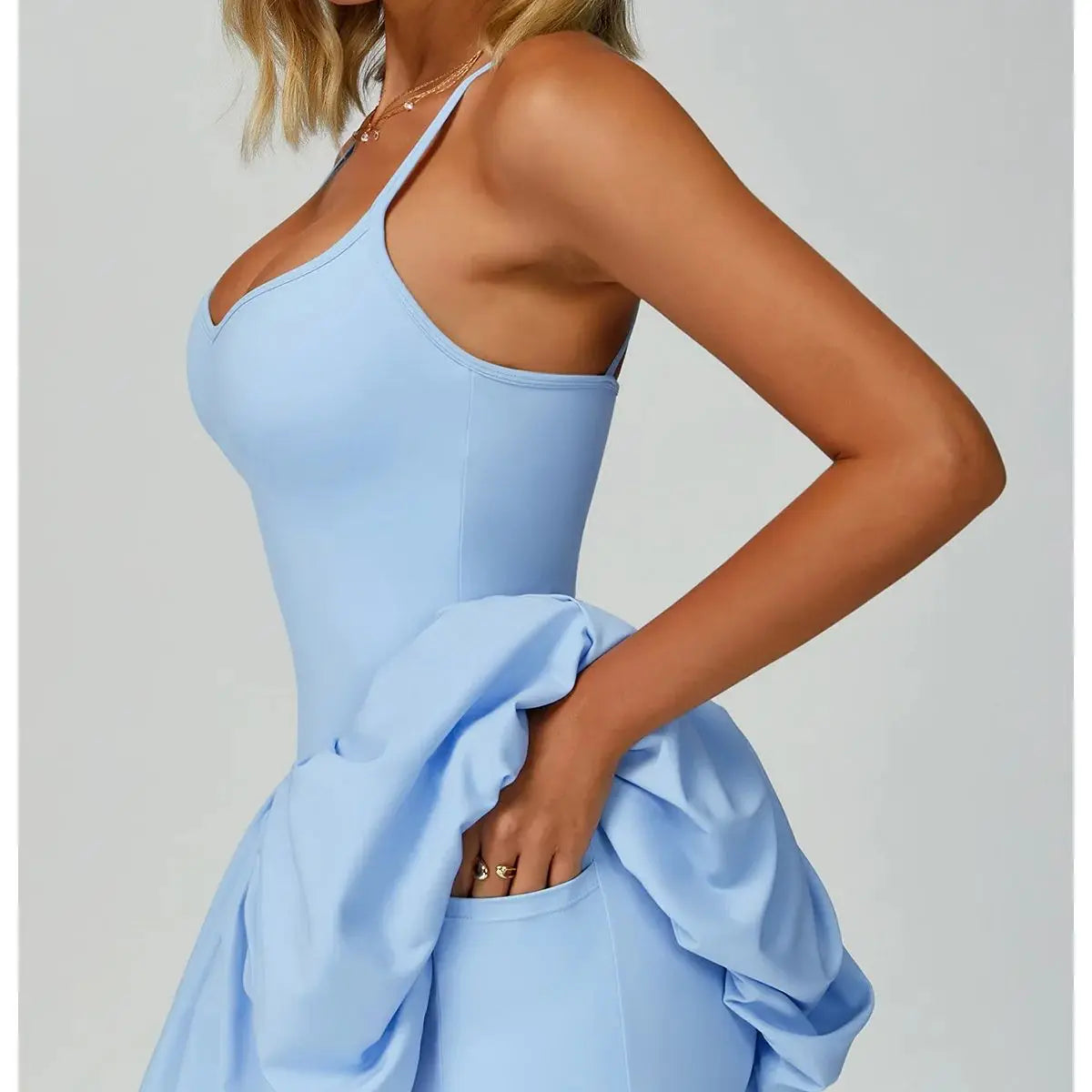 This yoga dress is designed for women and features a sleeveless, solid-color design. It's suitable for year-round wear and is available in sizes S, M, L, and XL.